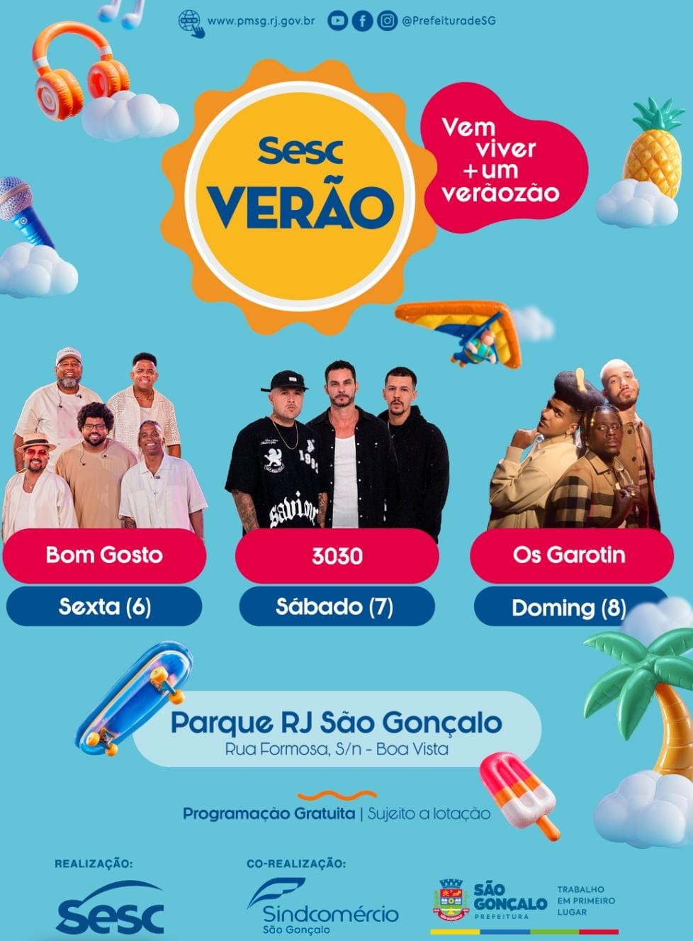 Entre os dias 6 a 8 de fevereiro, São Gonçalo recebe mais uma edição do Sesc Verão, que acontece pela quarta vez no município. Com entrada franca, o evento promove três dias de shows, além de atividades esportivas e culturais voltadas para públicos de todas as idades. Neste ano, o Sesc Verão acontece no Parque RJ São Gonçalo, no Boa Vista, que terá sua inauguração oficial no dia 8.