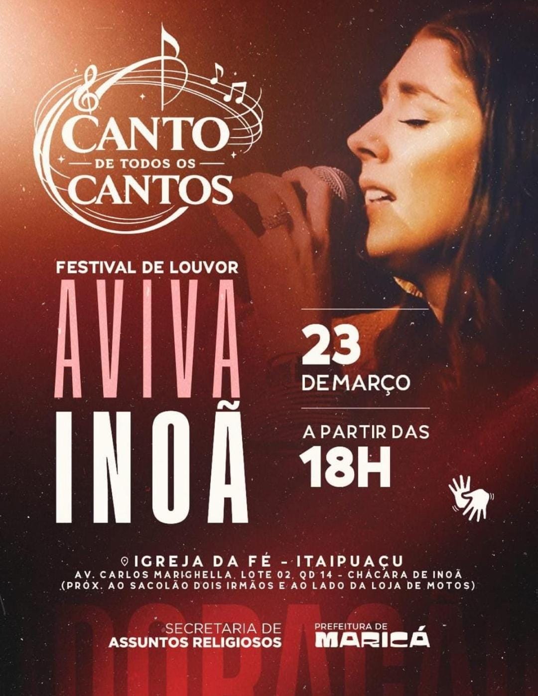 A Prefeitura de Maricá, por meio da Secretaria de Assuntos Religiosos, promove nesta segunda-feira (23/03), às 18h, o evento “Canto de Todos os Cantos – Festival de Louvor”. A atividade será realizada na Igreja da Fé, em Itaipuaçu, e tem como objetivo valorizar a música gospel e revelar novos talentos do município. As inscrições para participar estão encerradas.